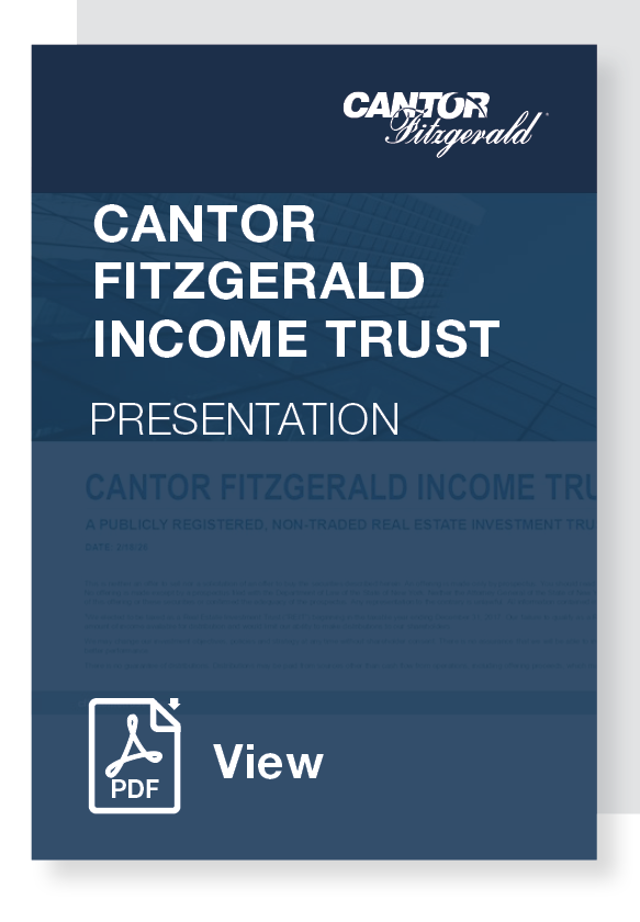 This website is neither an offer to sell nor a solicitation of an offer to buy securities. An offering is made only by the prospectus. This material must be read in conjunction with the prospectus in order to fully understand all of the implications and risks of the offering of securities to which the prospectus relates. A copy of the prospectus must be made available to you in connection with any offering. No offering is made except by a prospectus filed with the Department of Law of the State of New York. Neither the Securities and Exchange Commission, the Attorney-General of the State of New York nor any other state securities regulator has approved or disapproved of the securities, determined if the prospectus is truthful or complete. Any representation to the contrary is a criminal offense. Cantor Fitzgerald Income Trust, Inc. (“CF Income Trust”) prospectus and risk factors have been made available to you via the links below.